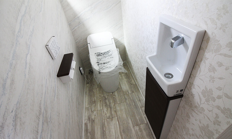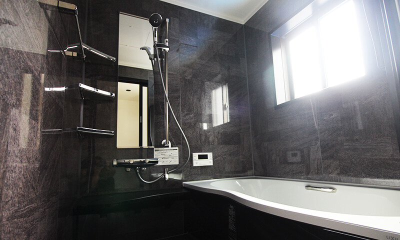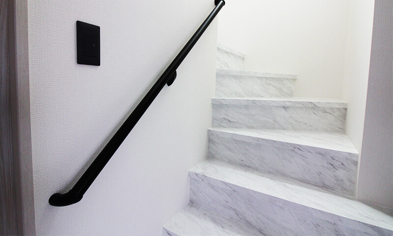 階段、ユニットバス共に耐久性とお手入れの簡単さを兼ねそろえた、シックな大理石のデザインを採用しました。