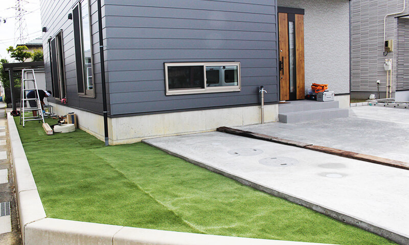 外観はガルバリウム製で、高い耐久性と豊富なデザインから近年人気が高い素材です。住宅地の中でも自然を感じられるよう、木彫の玄関扉と芝生のゾーンを設けました。
