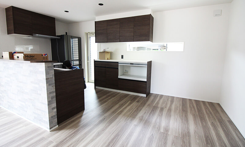 屋内は、クリーンな白壁を広範囲に広げダークブラウンや木彫を取り入れたナチュラルで落ち着きのある雰囲気に仕上げました。機能性の高いシステムキッチンを広い空間に設けて、明り取りの窓も設置しました。家族みんなが行き来しやすく、使いやすいキッチンです。
