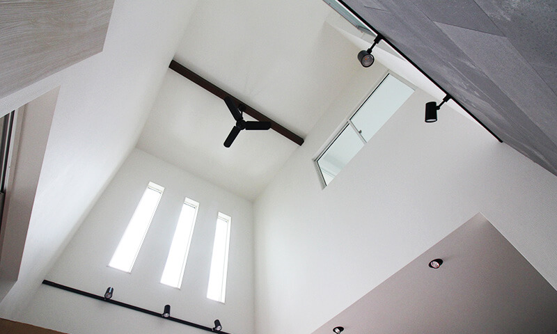 玄関スペースは天井まで高い吹き抜けに、明り取りの大きな窓とシーリングファンを取り付け、クリーンで明るい空間に。スポット照明も設置しましたので、夜はまた落ち着いた雰囲気にもなります。